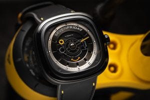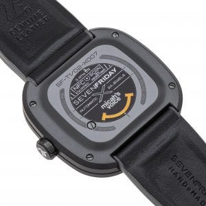 Like all our products since 2016, the watch is embedded with an NFC chip for authentication and three-year warranty registration using our proprietary SEVENFRIDAY App.