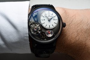 In fact, this is the only watch that I have owned that always gets a reaction from people who see it. They ask me if it’s a Breguet, and to that I joke that it is a Signature 1 from Greubel Forsey. Front facing balance wheels and some slight similarity in the arrangement of the dial elements aside, the Maurice Lacroix Gravity is singularly unique in the way that the design elements have come together to create an almost sensual object, curved in all the right places, and with a movement that seems to float under its glass crystal – the impetus to the name “Gravity” on which it was bestowed.