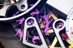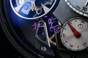 What’s even better, is the view of the silicon assortment and oscillator just next to and under the balance wheel, that gives the watch that special technical touch that elevates it to another level. It is apparently coloured differently in every watch on purpose, in various shades of blue to purple which is a nice little detail to know that the watch is yours and yours alone.