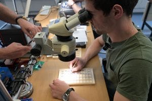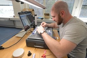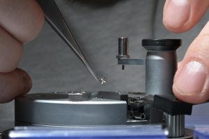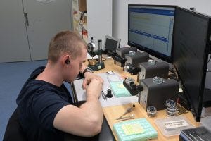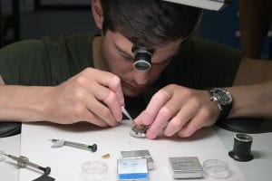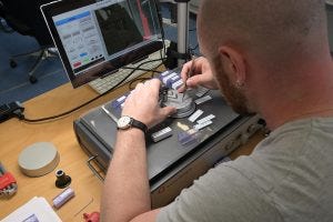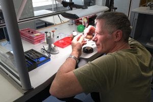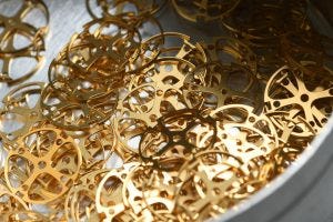 Parts that come from suppliers to Horage have to pass Silvan’s inspection before making their way down the assembly process. Here he is shown, visually inspecting ratchet wheels for quality. Given that he is the one who designs and engineers the components on the computer before they are made, he probably knows what to look for.