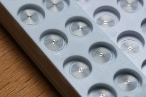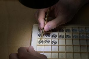 Based on Lenny’s classification, the balance wheels and balance springs are placed in these containers, ready for the next step in the assembly process.