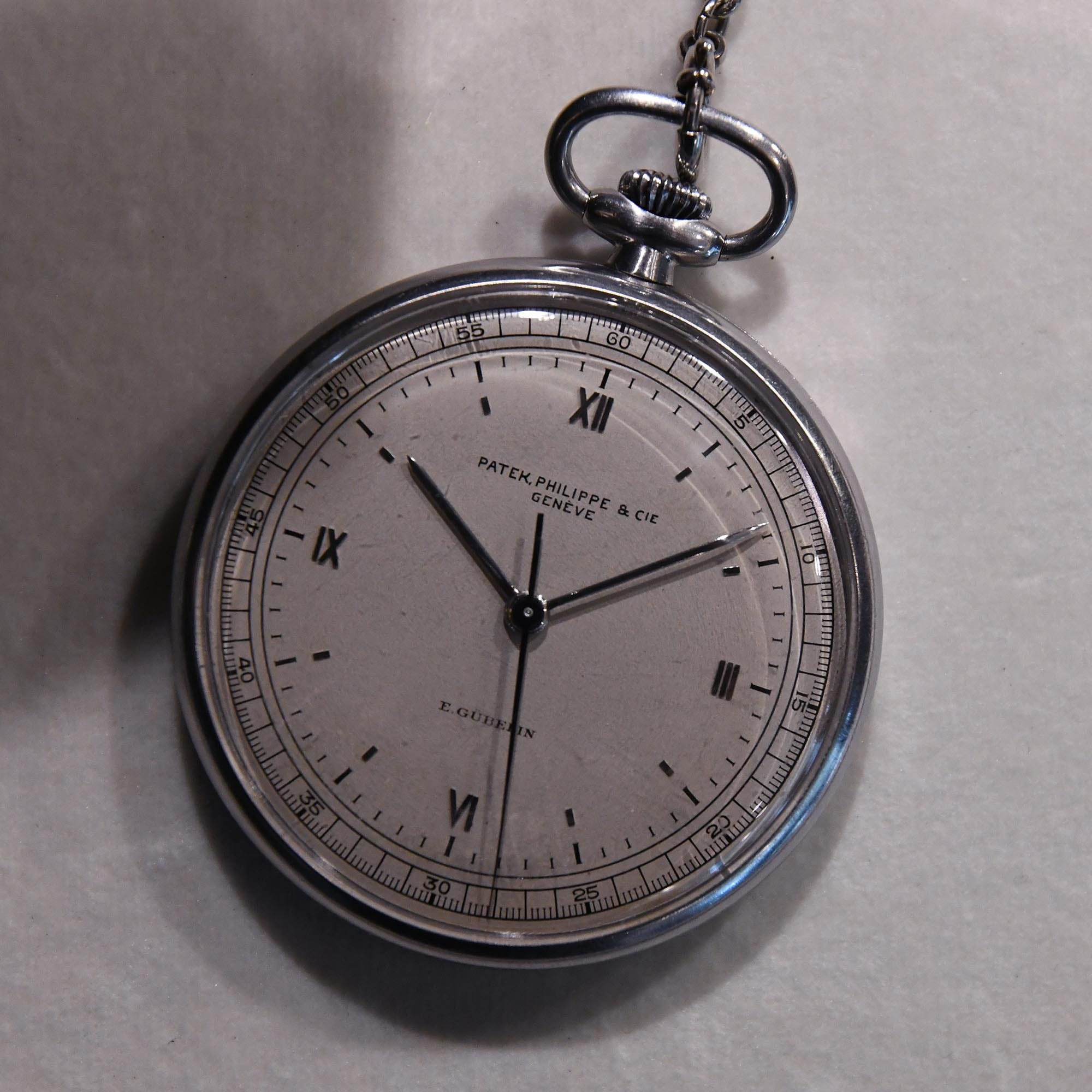 A Patek Philippe pocket watch from 1929 in stainless steel with centre seconds, that was retailed by famed Swiss watch retailer, Gübelin.