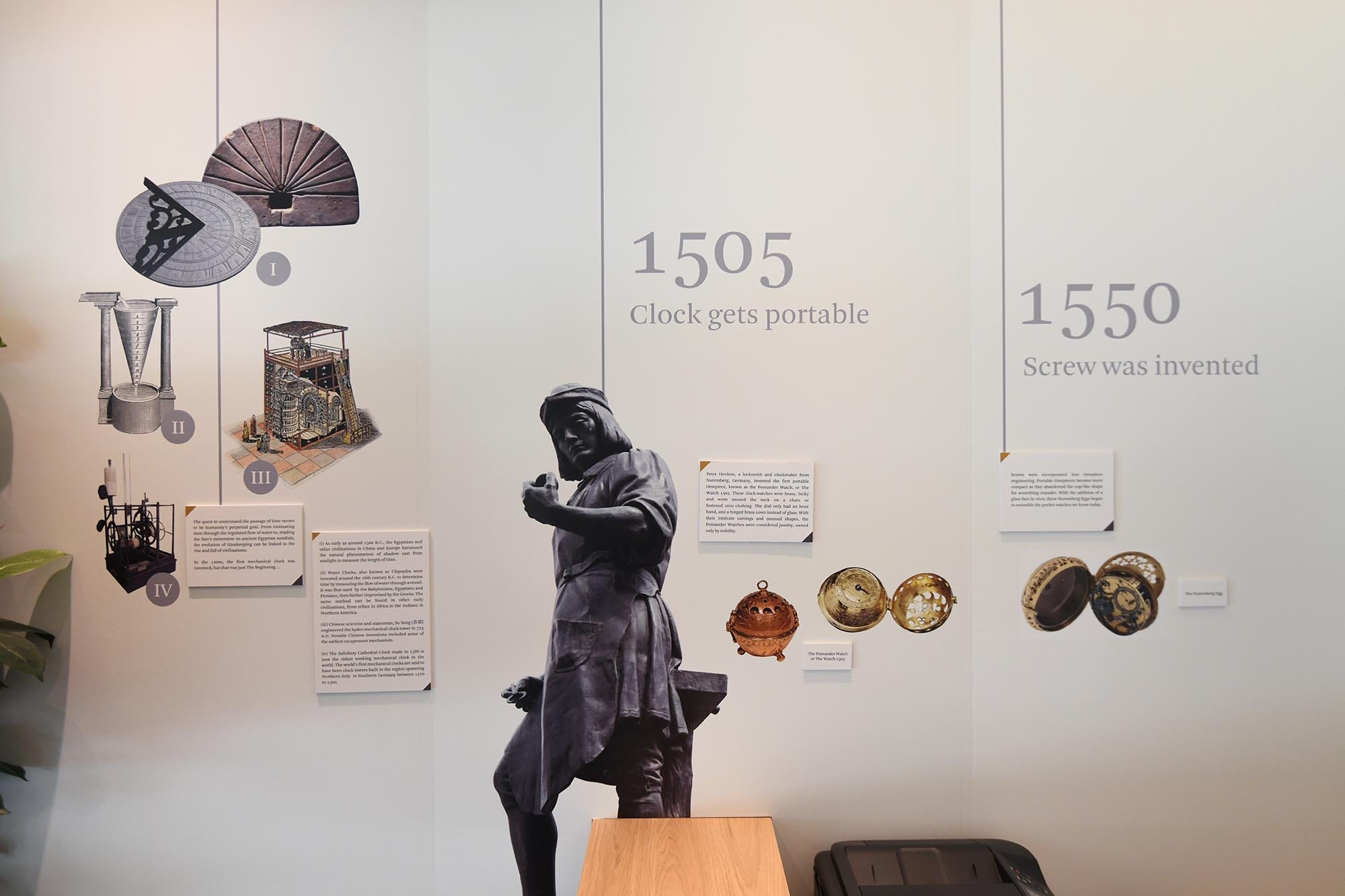 The walls of the boutique will show this “walk down memory lane”, showcasing the important milestones of timekeeping history, from sundials to water clocks to the first mechanical clock, then to Peter Henlein creating the first portable clock, and onward to the pocket watches on display.