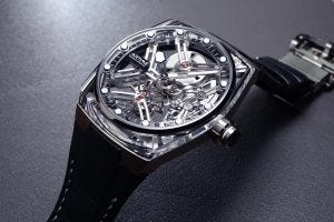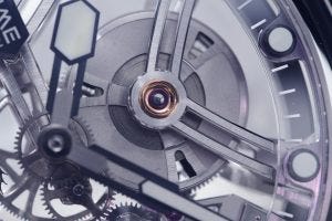 The ART01 is a watch defined by skeletonisation and openworking, with a case that alternates between transparent sapphire crystal and a titanium case middle that incorporates the lugs. The movement is crafted out of white gold that has a one-minute tourbillon located at 6 o’clock, and its skeletonisation enables an educational view of the watch, and how the power from the mainspring flows to the regulator. The bridges are also ever-so-slightly arched, with bases cut like blocks to give the sense of a solid, interlocking structure, whilst maintaining the flowing curved lines.
