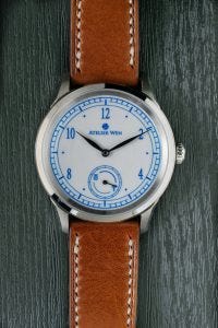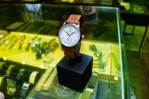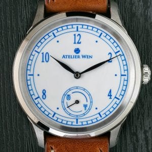 So this watch from Atelier Wen, a micro-brand from China had been at the Watch Wonderland store for some time already. It was, unlike the other watches that were in the display cases just mostly left alone, mounted on a C stand under a bell jar, and placed out in the open on the bespoke strap counter.