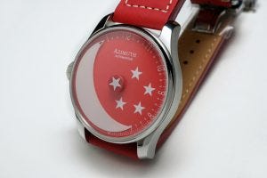 There have been quite a few variations of the Back in Time over the years, which I have attempted to show in this article, both in single and two hand versions. One notable example is the one with the Singapore flag on the dial, with the flag’s crescent moon moving backwards to tell the time.