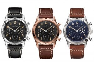 The new AVI Ref. 765 1953 Re-Edition is typical of pilots chronographs from the 1950’s, with a black dial framing a three register chronograph layout, with syringe hands, large lumed Arabic numerals and a steel bezel.