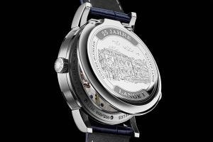 Notable as well is the engraved hinged cuvette in solid white gold depicting the Lange Headquarters that date back to 1873, as well as the the names of Walter Lange and Günter Blümlein, the architects of the brand’s re-emergence, as well as a relief engraving of the inscription “25 YEARS LANGE 1”.