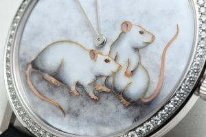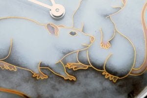 The dial in, Grand Feu cloisonné enamel, features two rats looking in the same direction to the right of the dial, and its creation starts by the transfer of the design in the initial drawing to the surface of the dial with gold thread. This creates small partitions on the surface, (or closons) on which the enamel pigments are placed, and after that the enamel is fired multiple times in a kiln before being varnished to give the dial its ethereal glow.