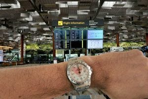 My recent trip to Terminal 3 at Changi Airport in Singapore was similarly surreal with mostly cancelled flights listed on the arrival boards, and a few staff sitting around. No passengers of course. Shown below, my noon-shot on my Rolex Explorer 2 with a heart shaped sticker on the crystal.
