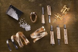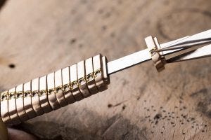 Each gold element that forms a bracelet link sits free on the titanium module within (that is holding the construction together as its spine). The roll of the gold elements turns around the flexible module, but this time each gold element link is independent of each other. This way, we can remove a link or links; we can change the colours; we can change the stones. It’s more versatile. It’s modular. So we can play with different elements to change the feel and the look.