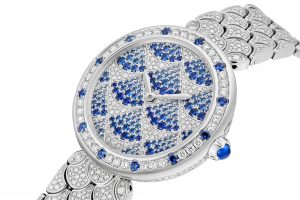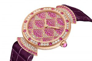 The other watch that we present is, the evolution in terms of the dial, our cocktail watch called Divas’ Dream, the round shaped watch with the small jewels around. It is a very successful line. We started with the production of this line more than ten years ago. Thanks to Divas’ Dreamtime, with this design, we won our first GPHG award in Geneva with the full diamond and emerald version. So this is a very important line for us. It’s easy to wear, very cute, with the opportunity to play with several elements on the bezel, the dial, the stones around the watch and even the patterns. So, here, we have two different executions – One with the malachite and the stones and the other one with diamonds and ruby.