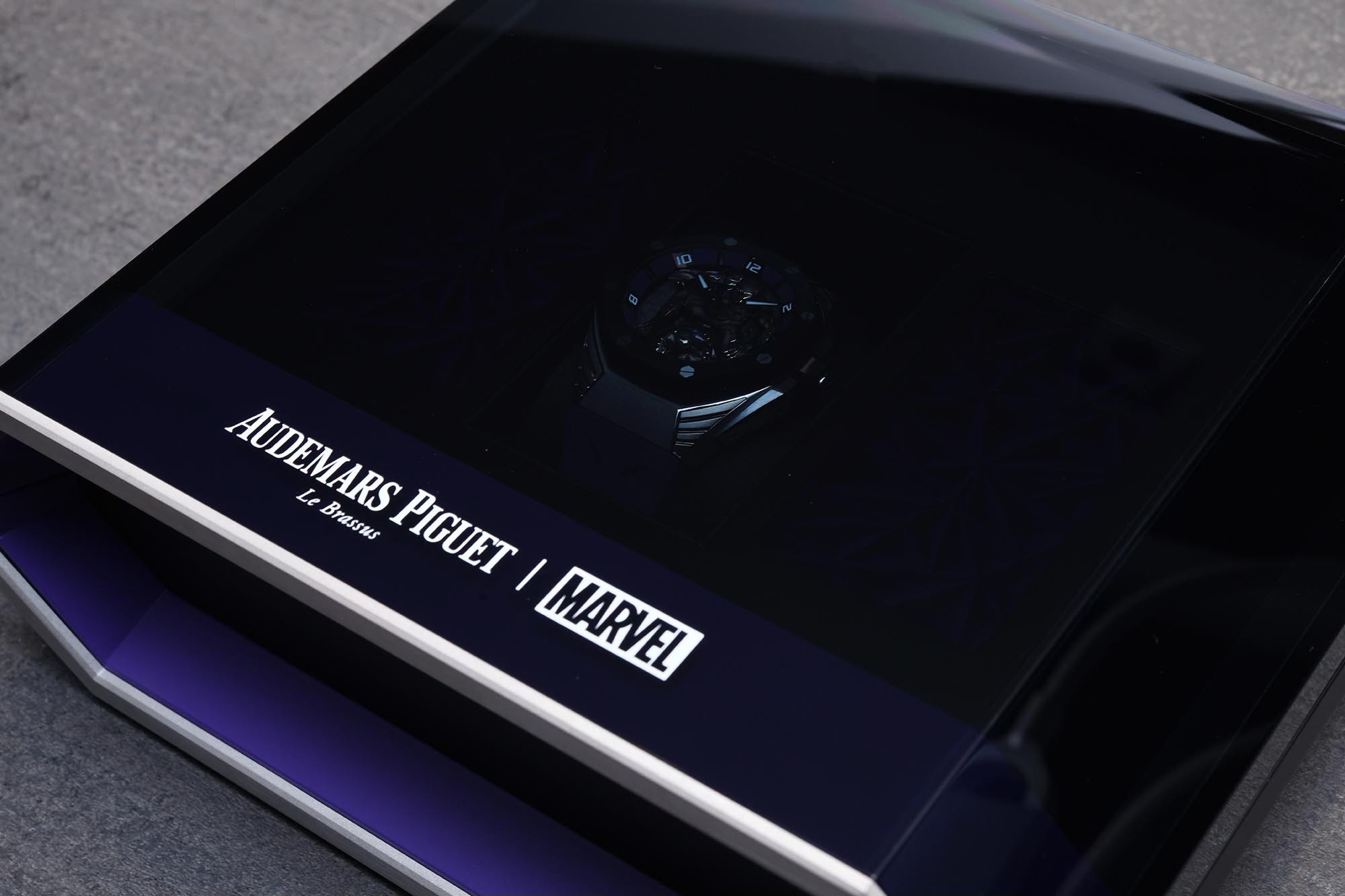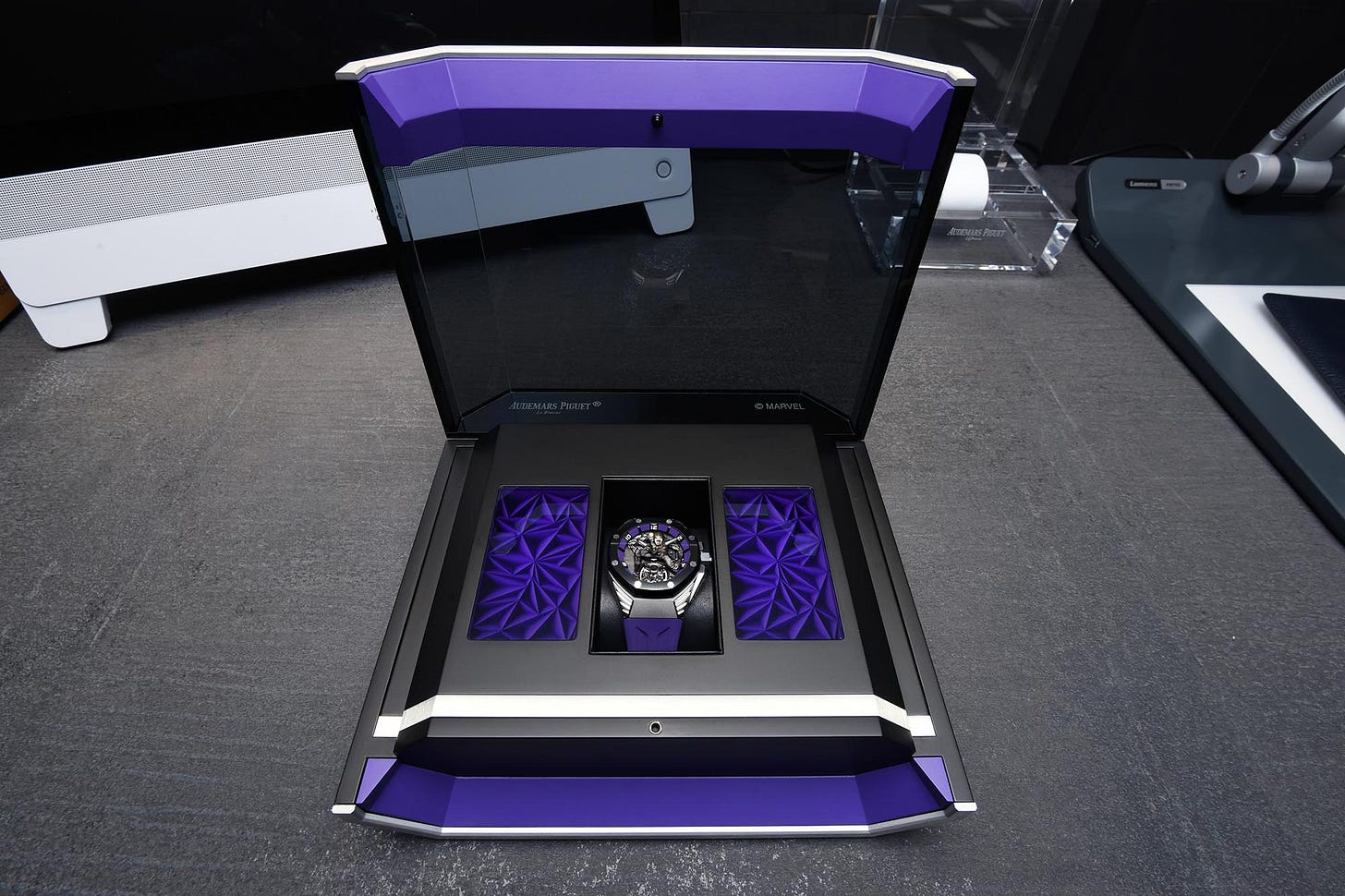 The box of the Royal Oak Concept Black Panther is of a space age design, with a tinted cover through which you can see your watch.