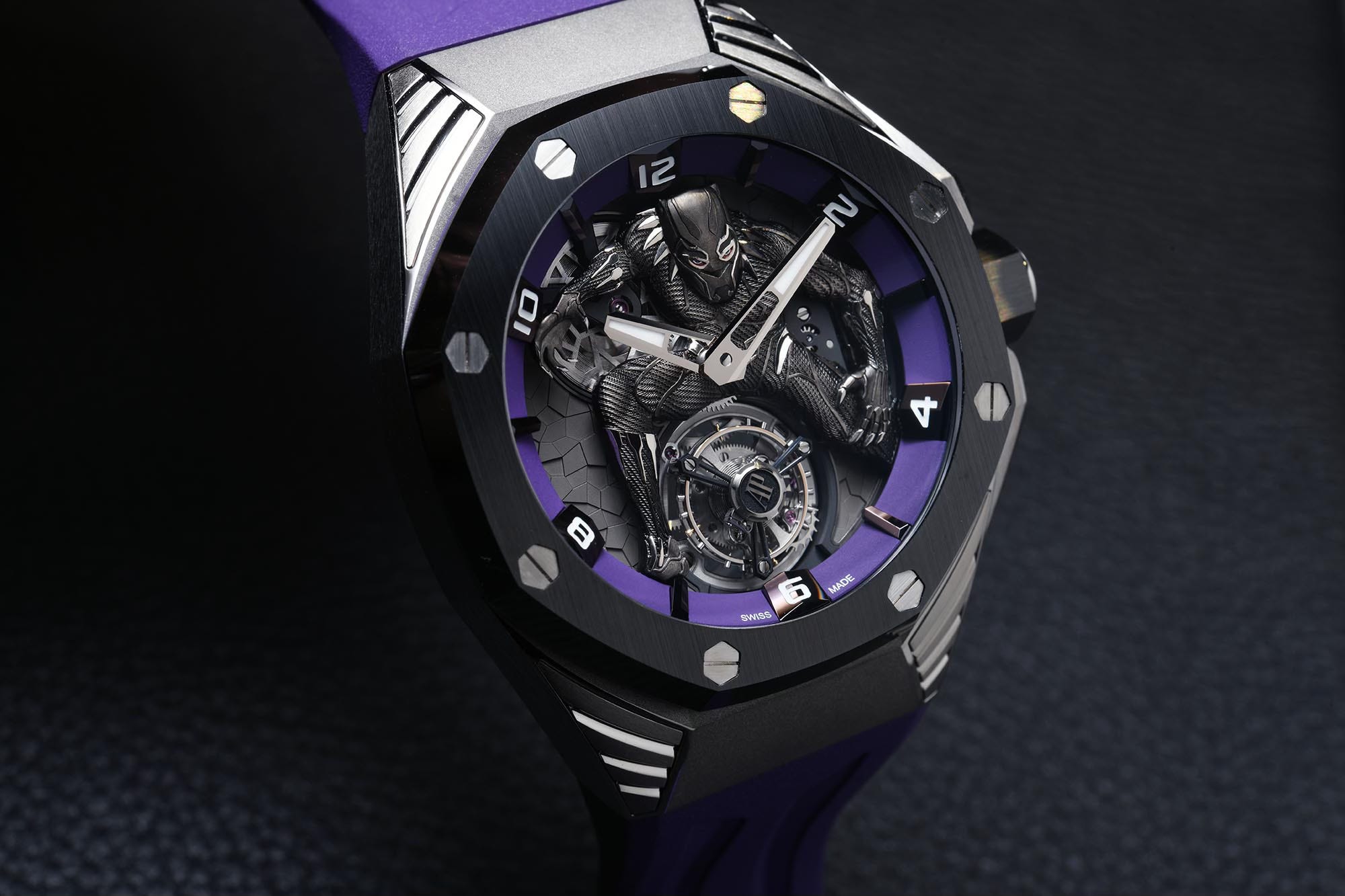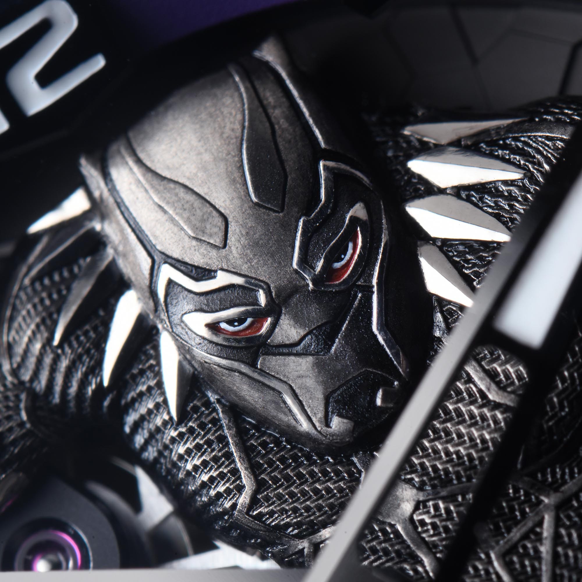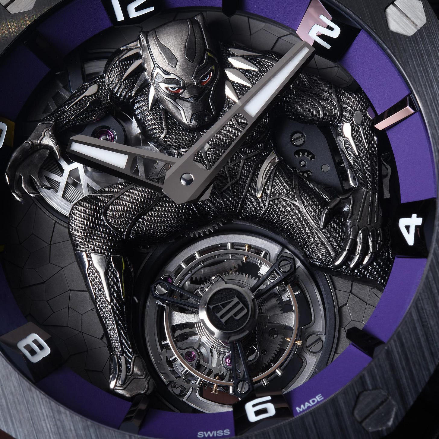 It is so well done that you can use a loupe to enjoy the abundance of minute textures and details, just as you would the finishing of a high-end movement. There, you will find a figure so beautifully rendered, that it almost seems alive. Just look at the texture of the suit and consider how a human hand had to carve all of that under a microscope. Then look into the eyes of the Black Panther , and you can almost feel the anger of T’challa piercing your soul.