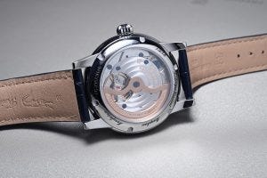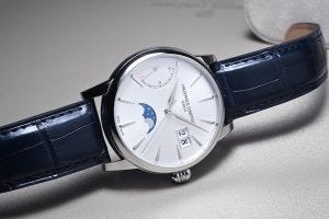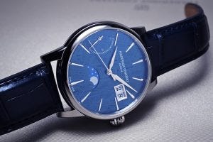 Dial: Navy blue meteorite (platinum model), Grey dial with sunray finishing (rose gold model), Blue or Silver with sunray finishing (stainless steel models), applied diamond cut indexes, hand-polished silver colour hour, minute and second hands, date window between 2 o’clock and 3 o’clock, moonphase at 6 o’clock, power reserve indication at 9 o’clock