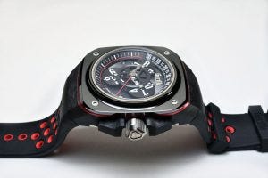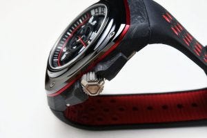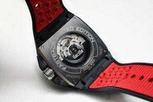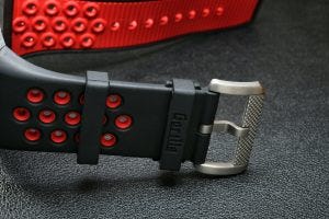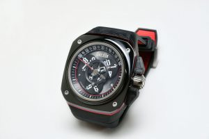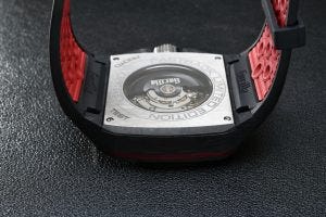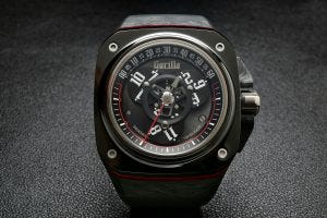 At 44mm wide case, and 14mm high, it carried the attractive and well defined design language of the Gorilla watch brand, being large, squarish and bold, with exposed screws on the ceramic bezel atop a case of layered carbon composite and a motorsport inspired colour scheme coming from red anodised aluminium and titanium.