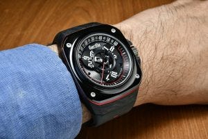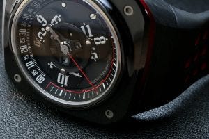 Well, the first was the complication on offer – the wandering hours, which tells the time via three discs marked with the hours, joined by spokes to the middle of the dial, that rotate and point to a minute track along the upper edge. By reading the corresponding hour along this minute track, the time could be read. Interestingly, buying a watch with a comparable complication like this can only be done with two brands – Audemars Piguet – with the Starwheel model from the early 90’s and currently now, Urwerk. As you well know, the prices for watches from these two brands are quite high, which brings us to the second reason for the desirability of the Fastback Drift GT – price.