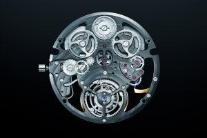 To counter this the center and third wheels are treated with a special coating for reducing friction and are also, like most of the other gears, manufactured using Micro Electro Mechanical Systems (MEMS), a forming technique used for manufacturing semiconductors. This enables the production of a perfect gear tooth shape with precision measured in microns. Lastly, a precise ceramic gear is applied to the stop wheel, which is controlled by a small spring that releases power every second, to move the tourbillon cage.