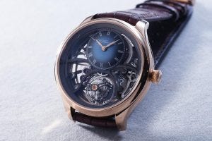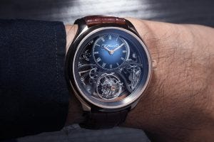 The watch is housed in decadent 18 carat red gold with a domed sapphire crystal, and is delivered on a brown alligator leather strap fastened by an 18 carat red gold red folding clasp engraved with the Moser logo. The dial is off-centred, executed in a Funky Blue fume dial with Roman numerals and feuille hands in red gold. At 6 o’clock is the distinctive tourbillon cage rotating once per minute, with its two-armed swooping bridge on the tourbillon cage.