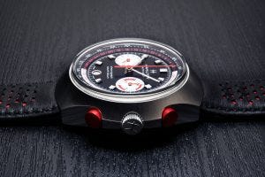 On the wrist, the watch is large and bold, with the red accents, imposing case size, that when coupled with the 1970’s styling of the case on a racing style strap makes for a memorable presence.