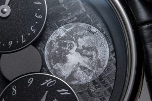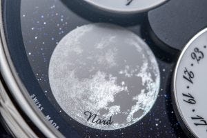 An interesting detail is visible at the 12 o’clock moon – as it is adorned by an image of Pegasus designed by the “dreamer-designer” Dimitri Rybaltchenko entitled Pleine Lune (Full Moon). The other moon at 6 o’clock, or the view of it through the northern hemisphere, is by contrast, a realistic depiction.