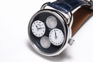 It is perhaps not so obvious that the moon looks different from the northern and southern hemispheres of the earth. In the Southern Hemisphere, people see the moon ‘upside down’ so the side which is shining (sunlit) seems to be the opposite of the view from the Northern Hemisphere. This fact accounts for the two moon disks mounted in the centre of the watch, and are not, as some might suggest, views of the near and far side of the moon.