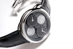Two 100 piece limited edition versions of the watch are available, the first comes with white-lacquered mobile counters with black indications against an Aventurine dial, while the second comes with gradated grey-lacquered mobile counters with white indications against a Meteorite dial.