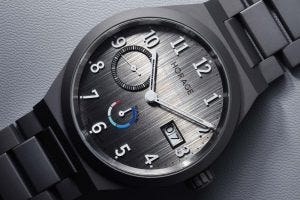 The Horage Autark 10 Years Edition features an integrated case and bracelet design that is executed in titanium. Boasting a hardness value of over 800 Vickers, the case and bracelet (with dual push button operation) is blast hardened for extra durability, and comes with an additional sueded biodegradable leather strap with deployant clasp. The dial is an anthracite colour with vertical brushing that appears to change colour and texture depending on the way light hits it. Arabic numerals populate the dial, as do the small seconds indicator at 9 o’clock, the power reserve indicator at 6 o’clock and the big date complication at 3 o’clock.