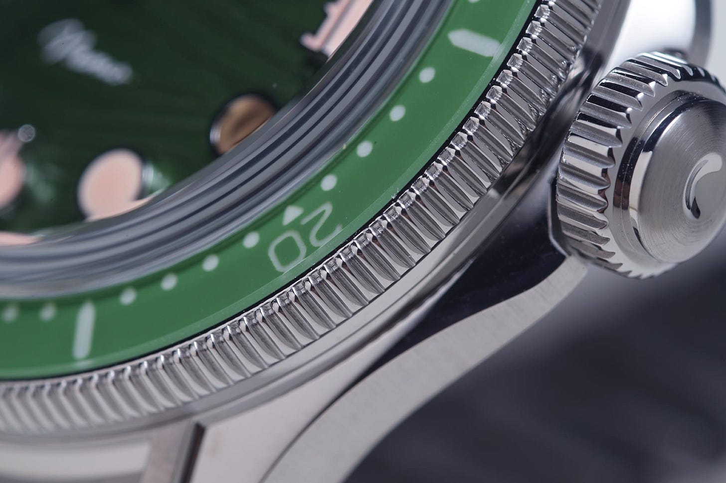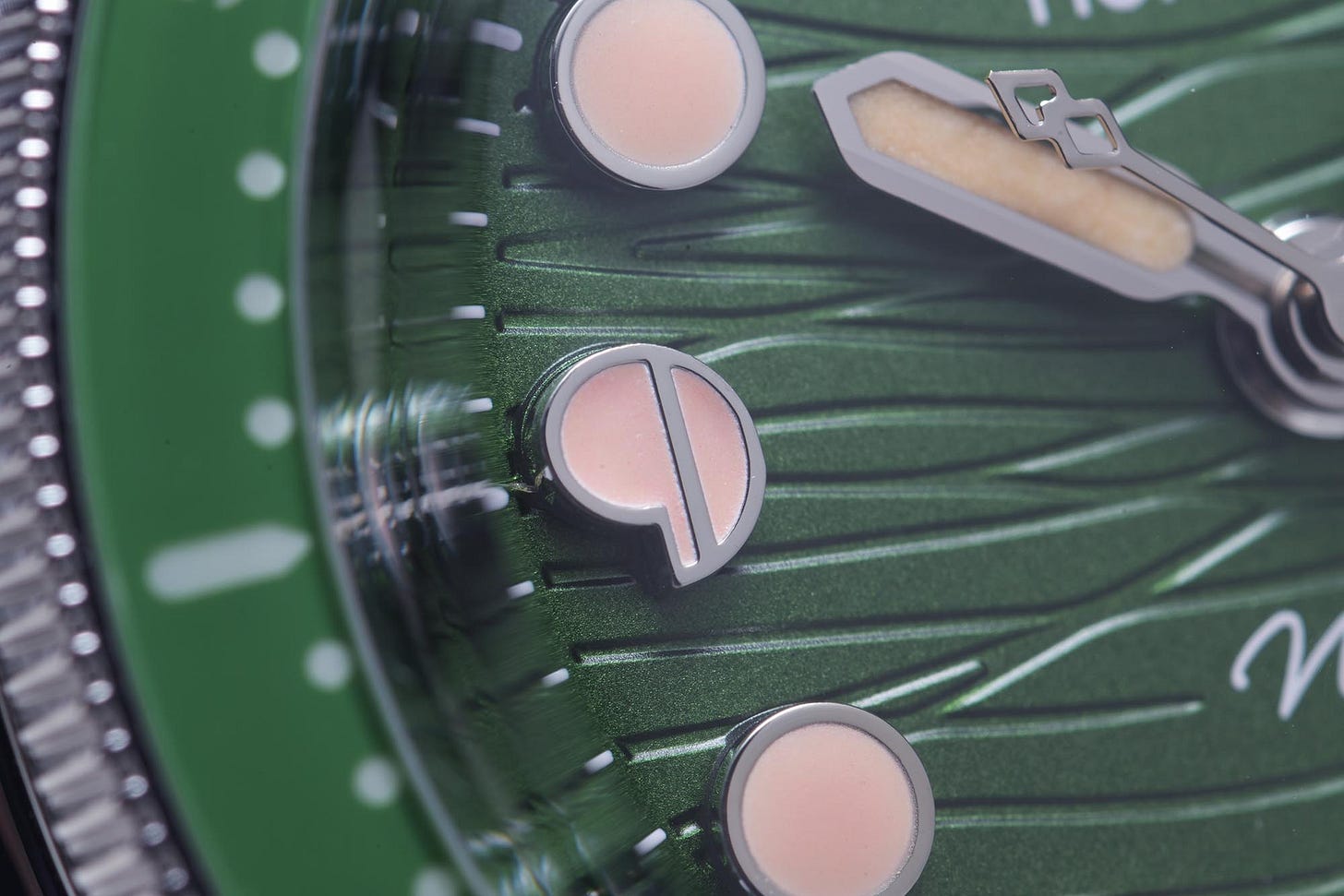 7 colours are available at the time of writing – Ocean (blue), Kelp (green), Abyss (black dial, grey bezel), Clown (orange dial, grey bezel), Coral (silver), Golden Hour (champagne dial, grey bezel) and Pistachio (light green dial, black bezel). Quantities are limited, as many of these watches have already been delivered via the brand’s Kickstarter campaign earlier in 2024.