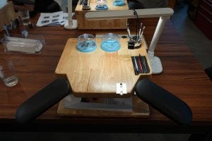 IHT 4: My watchmaking bench, with all the tools set up. Notice the arm rests and the fact that the bench is placed on a table top. This helps the movement I am working on closer to my eyes, and is more ergonomic for my arms and fingers.