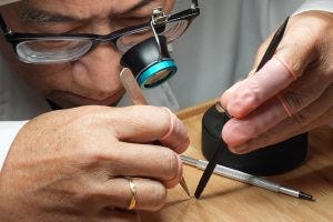 IHT 22: Here, I am using a rubber finger cot to cover the tool to make sure that the watch hands are set to the proper height. The rubber finger cot there to make sure that I don’t scratch the hands.