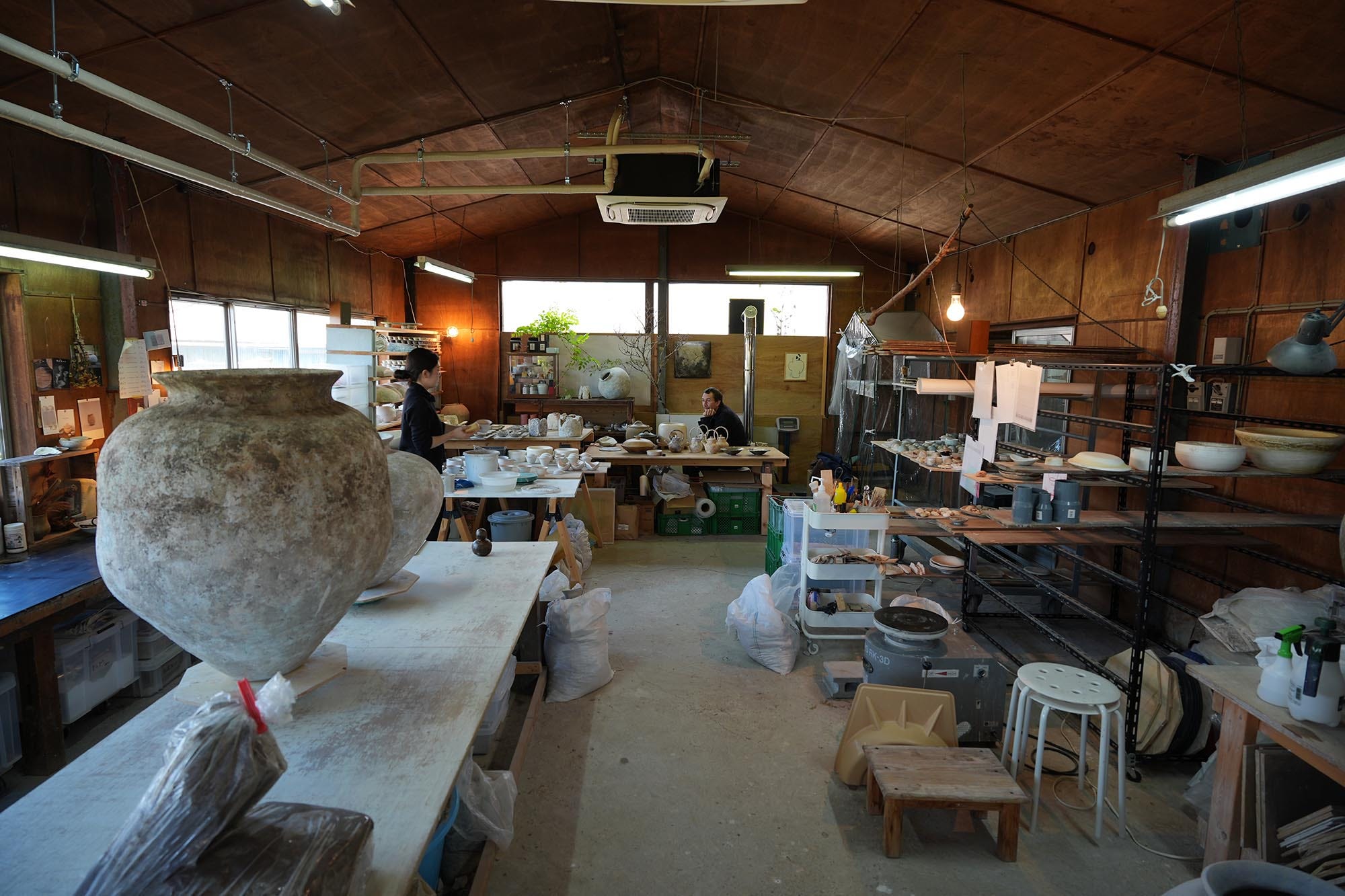 A large, rustic space dominated by a massive kiln. Clay dust on the floor. Tools aged by repetition. Shelves lined with organic, earthy forms. It feels warm, grounded, shaped by soil and fire.