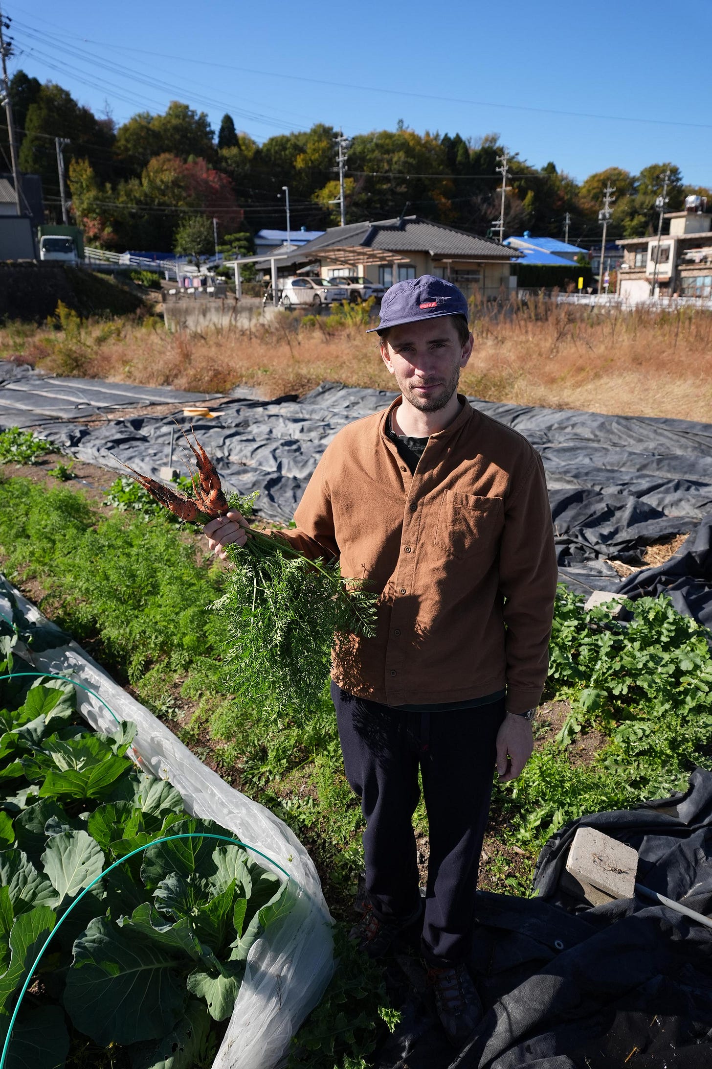 During my visit, Alan took me to the small farm plot he tends in the Japanese countryside. He grows carrots, garlic, pumpkins — simple crops, but grown with care.