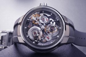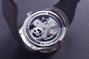 The 50 meter water-resistant case, further, has three dimensional, variable geometry lugs that are hand polished, with a straight graining on the surface, and this flows seamlessly into a rubber strap embossed with the Greubel Forsey brand values on the underside, and finished with a titanium folding clasp.