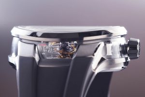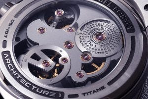 Utilizing a movement with its discreet elements spread throughout the dial and emerging from the frosted mainplate, it’s easy to appreciate how they appear to resemble the buildings of a city. And whereas one might appreciate these elements like a god looking down on them from the sky via the dial, what makes this new watch special is the brand new case that, through the apertures from all angles at the sides, allows light to enter through a single peripheral sapphire crystal, offering an unprecedented view of the movement within, that itself now comes with polished titanium bridges that swoope from the mainplate to suspend the various components.