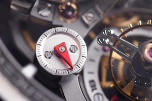 Aside from that, there is the small seconds indicator at 8 o’clock, marked by a red triangle against the frosted white finish of a very small sundial. Then there is the power reserve indicator at the 3 o’clock position, marked by a red triangle moving over a conical disc displaying the 90 hours of power reserve (at chronometric performance) that the watch is capable of.