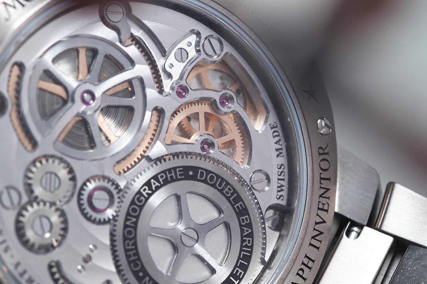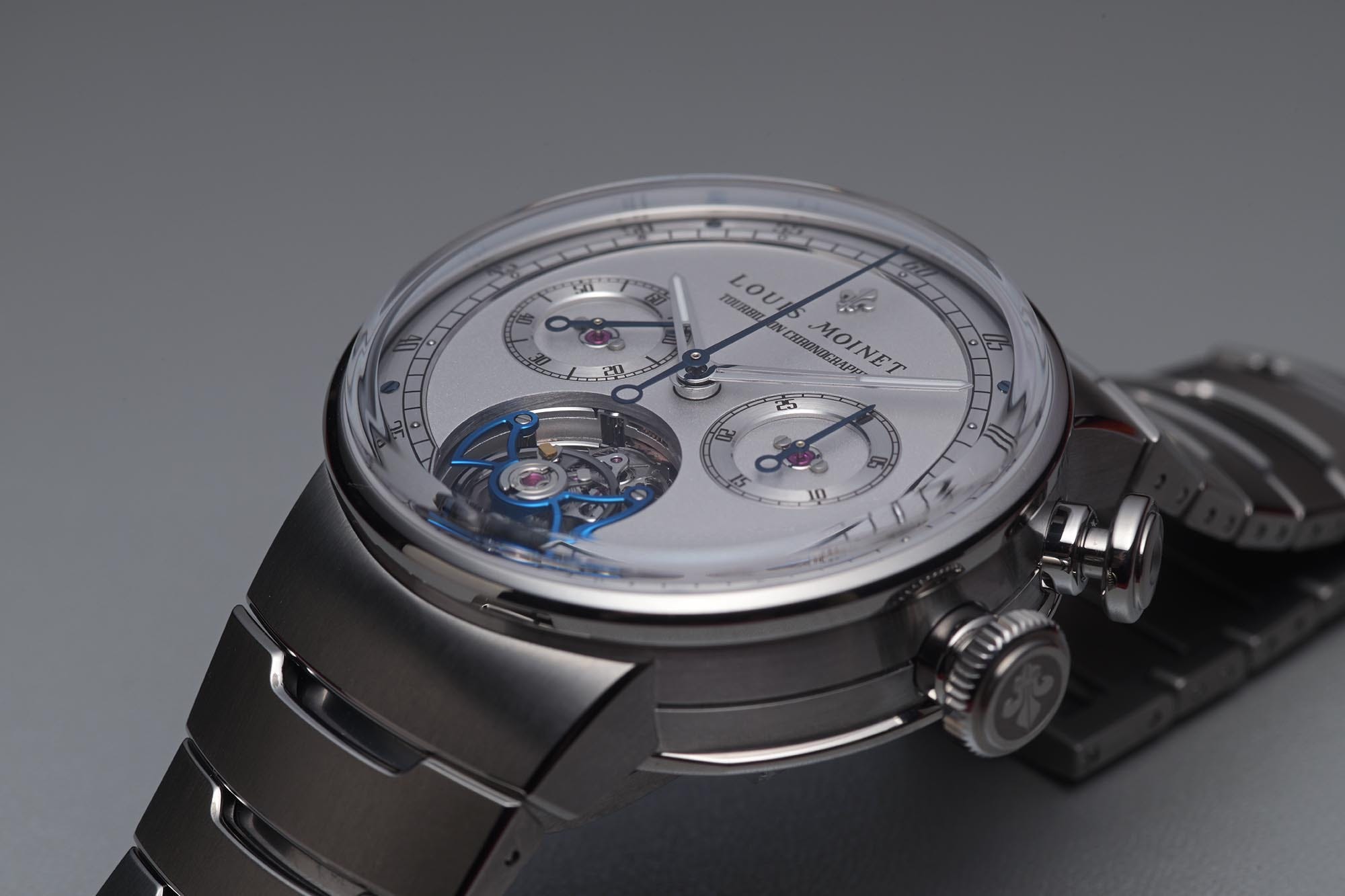 Specifications note: The Louis Moinet 1816 Tourbillon Chronograph is housed in a 40.6 mm polished and satin-finished Grade 5 titanium case, constructed from 51 components. The case follows the design codes of the original Compteur de Tierces, including the Directoire-style semi-bassine profile, smooth case middle, double gadroon, monopusher, and a crown decorated with the fleur-de-lys, referencing Bourges, Louis Moinet’s birthplace. The rhodium-plated dial combines satin-finished and bead-blasted surfaces, with small seconds and 30-minute chronograph subdials framed by satin-brushed rings and Arabic numerals. Visible dial details include a ruby-set barrel flanked by polished screws, engraved dial markings in the typeface of the original, blued steel chronograph and subdial hands, and a blue DLC-coated tourbillon cage. The watch is fitted to a specially designed Grade 5 titanium bracelet with broad curved links, alternating satin-brushed and polished finishes, and an articulated construction intended to follow the wrist comfortably.