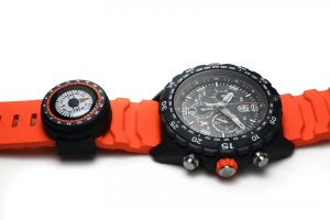 + case with orange accents, 300 metre water resistance and a unidirectional diving bezel. The two models are essentially the same and can be differentiated by the colour of their rubber straps – (ref: 3741) for black and (ref: 3749) for orange, that also have a diving grade compass on them.