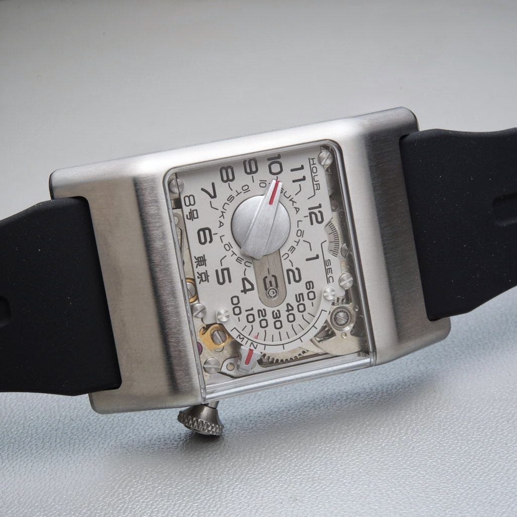 For the first time, the case adopts a square profile—though not in the conventional sense. The sides are sloped, softening the geometry and making it surprisingly ergonomic. It presents as a square, but wears with a kind of mechanical fluidity that aligns perfectly with Katayama’s design language.