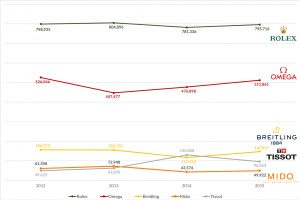 This table above, compiled from the annual reports of COSC, shows the position of Mido relative to the other well-known names on the list of top chronometer producers including Rolex, Omega, Breitling and Tissot between 2012 and 2015.