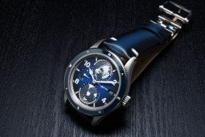For those not too keen on the bracelet, the watch is also offered on a blue vintage Sfumato calf and alligator leather straps, and also a woven blue NATO strap.