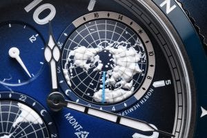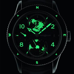 On the dial, there are also the same cathedral shaped hands with “cloisonné” design, with Arabic numerals coated in white Super-Luminova, and with the dial signed with the original Montblanc logo. The views of the northern and southern hemisphere as well come with blue luminova dots to denote the location of the seven tallest summits on each continent, as well as something new, a new blue luminova line to denote the longitude reference meridian through Greenwich in the UK. This means that the watch preserves its party trick of having the globes and the other important indications, glowing in the dark, but this time with the visibility of the reference meridian as well.