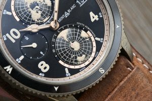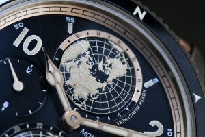 Funny story – I got a Montblanc Time Walker Hemisphere’s Southern Hemisphere watch to review way back in 2013, and I had a hell of a time trying to figure out how it worked. I managed to solve it in the end when I realised, on account of the name of the watch, that the dial of the watch showed a view that is basically that of the world from the bottom of the planet or the Southern Hemisphere. That view is exactly what you see here in the Geosphere’s 6 o’clock sub-dial, and just to confirm, look for the recognisable shape of Australia in the picture above.