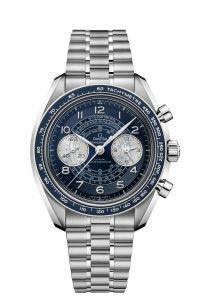 Measuring in at 43mm, in stainless steel or Omega’s proprietary Bronze Gold case, the watch is a bi-compax chronograph with subdials for the running seconds at 9 o’clock, and an integrated hour and minute chronograph subdial at 3 o’clock. Arabic numerals make the dial very readable, even with the amount of scales on the dial, being applied numeral markers that bring extra depth to the dial. The aluminium bezel insert (colour matching with elements on the dial) is the trademark tachymeter for which the Speedmaster is famous for – the Speedmaster was the first watch with a tachymeter bezel in 1957, after all. The Bronze Gold model, however, sports a brown ceramic bezel, its sheen adding a further touch of luxe to its warm toned case.