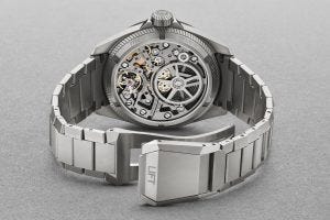 It’s a skeletonized version of the brand’s in-house 10-day power reserve movement, in a new titanium case with integrated bracelet. Also, it’s a stunner.