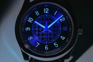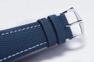 Lastly, a word on the blue strap with white seams. While it might look like textile, it is instead delicately embossed to look that way. It is in fact made of calfskin, and colour coordinated to match the carbon fibre pattern on the dial centre.
