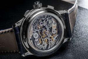 The best thing about a split seconds chronograph is the wonderful view of the movement, which is an order of magnitude more complicated than a standard chronograph, and so there are more elements to enjoy. Here in the manually wound CHR 29-535 PS caliber, we see the column wheels and horizontal clutch. Also one of the nice refinements that Patek Philippe have with this movement is the instantaneous minutes in the 30 minute counter, and can enjoy the satisfying jump of the minute hand to the next elapsed minute, something that only a high end chronograph like this can offer.