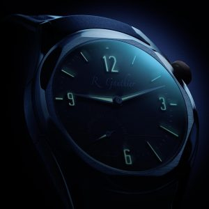 The hands, applied numerals and indices are all made from solid white gold and filled with Super-Luminova while the dial is made from natural titanium that has been sand-blasted and treated with a special coating that protects it against UV rays.