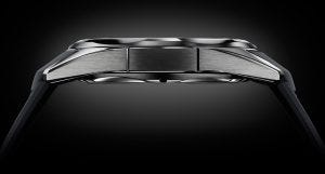 The case is made of titanium and paired with an integrated rubber strap. Although circular, it has an incredibly nuanced case design that is characterised by a striking faceted bezel, which has been further enhanced by alternating satin and polished finishes. This design is also echoed on the case back while the rest of the case features a polished top surface with brushed flanks.