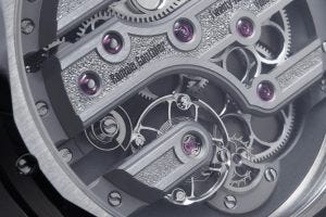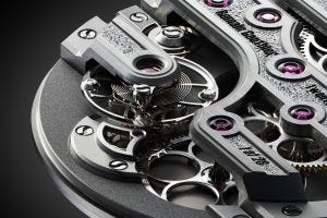 All the gears, including the ratchet and escape wheel, feature Romain Gauthier’s signature circular spokes while the screws are proprietary and feature a patented, S-shaped slot that requires a custom screwdriver.